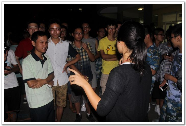 9月8号,中秋佳节,猜灯谜环节办得也是有声有色。现场布置得很温馨,地面上用气球摆成心形,四周围上了彩灯,挂起了大红灯笼。关上灯,微微灯影下猜灯谜,别有一番意境。猜灯谜中,同学们充分展现了聪明才智。赢家们领走了主办方精心准备的奖品——明信片。该系列明信片是学长学姐们自己制作的,以新生们的故乡为背景,结合中秋思乡元素,让新生把思念寄回家。还有就是,活动中的亮点,请到了军训的教官,教官们打拳展军姿,同学们高声喊拉歌。现场一度达到了高潮,教官,同学们一同庆中秋。