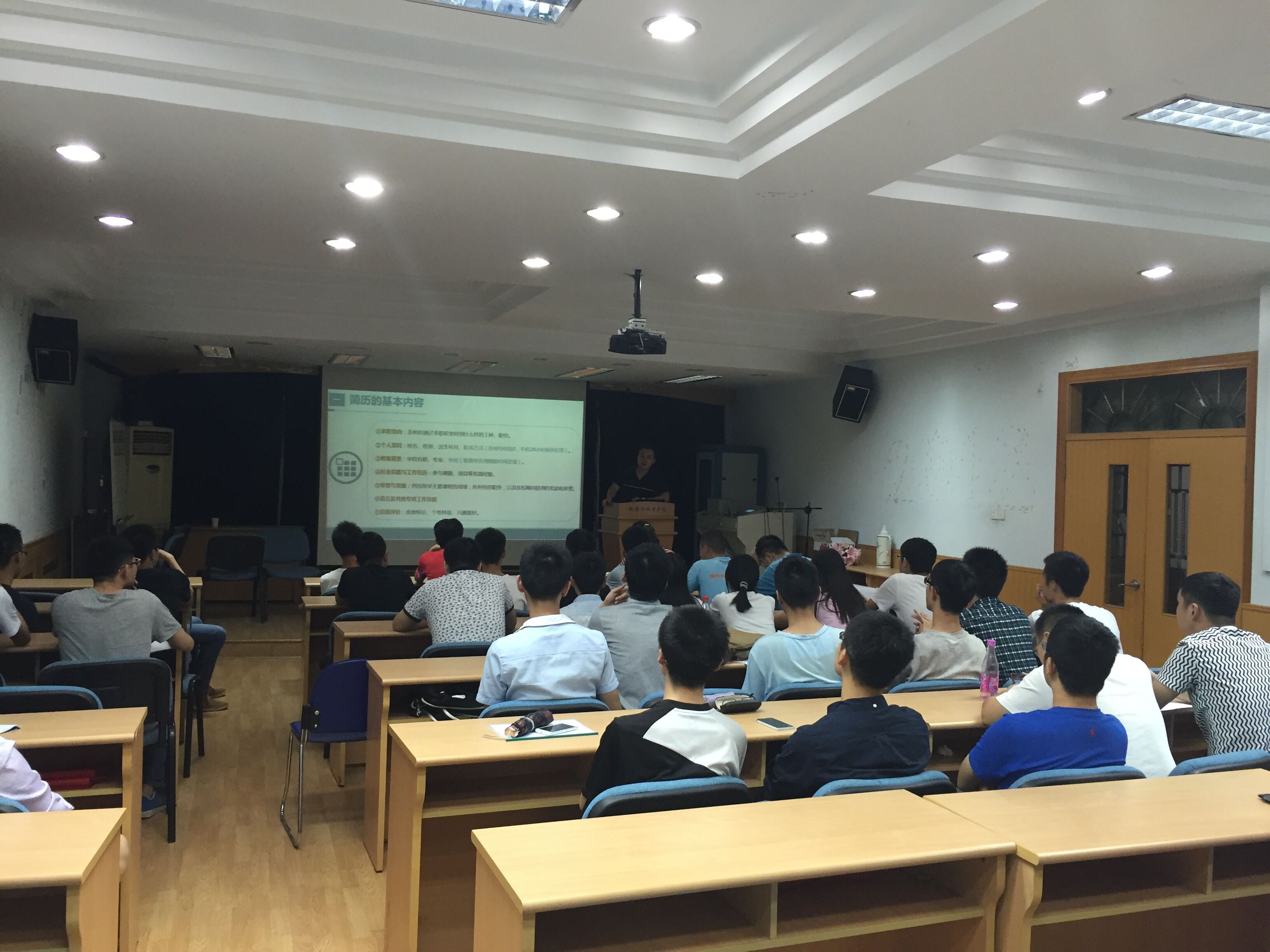 报告之始,辅导员赵哲老师给同学们讲述就业流程与相关注意事项,让同学们更清晰的了解就业。随后赵哲老师针对简历制作开展了专题指导,同时赵哲老师把在参加招聘会过程中看到学生的简历问题进行汇总,重点对近期同学们出现的简历问题进行指导,帮助同学们更好地做好求职的第一关。报告最后,廖光兰老师给同学进行提升面试中自我介绍的专题指导,其中包括自我介绍的文稿准备、现场模拟的练习、字数的限制等各方面细节问题。并且模拟现场时的练习:语速、声线、眼神、动作手势等问题均要注意,这让同学们更好的认识到面试过程中各种细节问题,帮助同学提升表达能力。