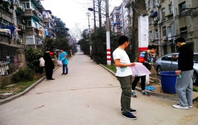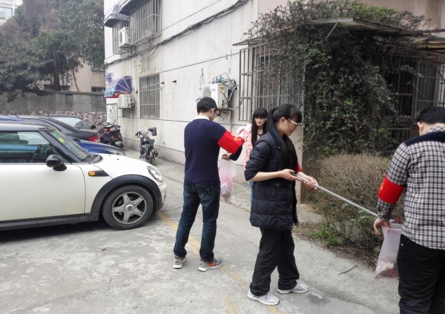 下午同学们到达活动地点并短暂休整后,同学们戴上红袖章,按原计划分为四个小组开始活动,两组负责清除路面垃圾,另两组负责巡视。