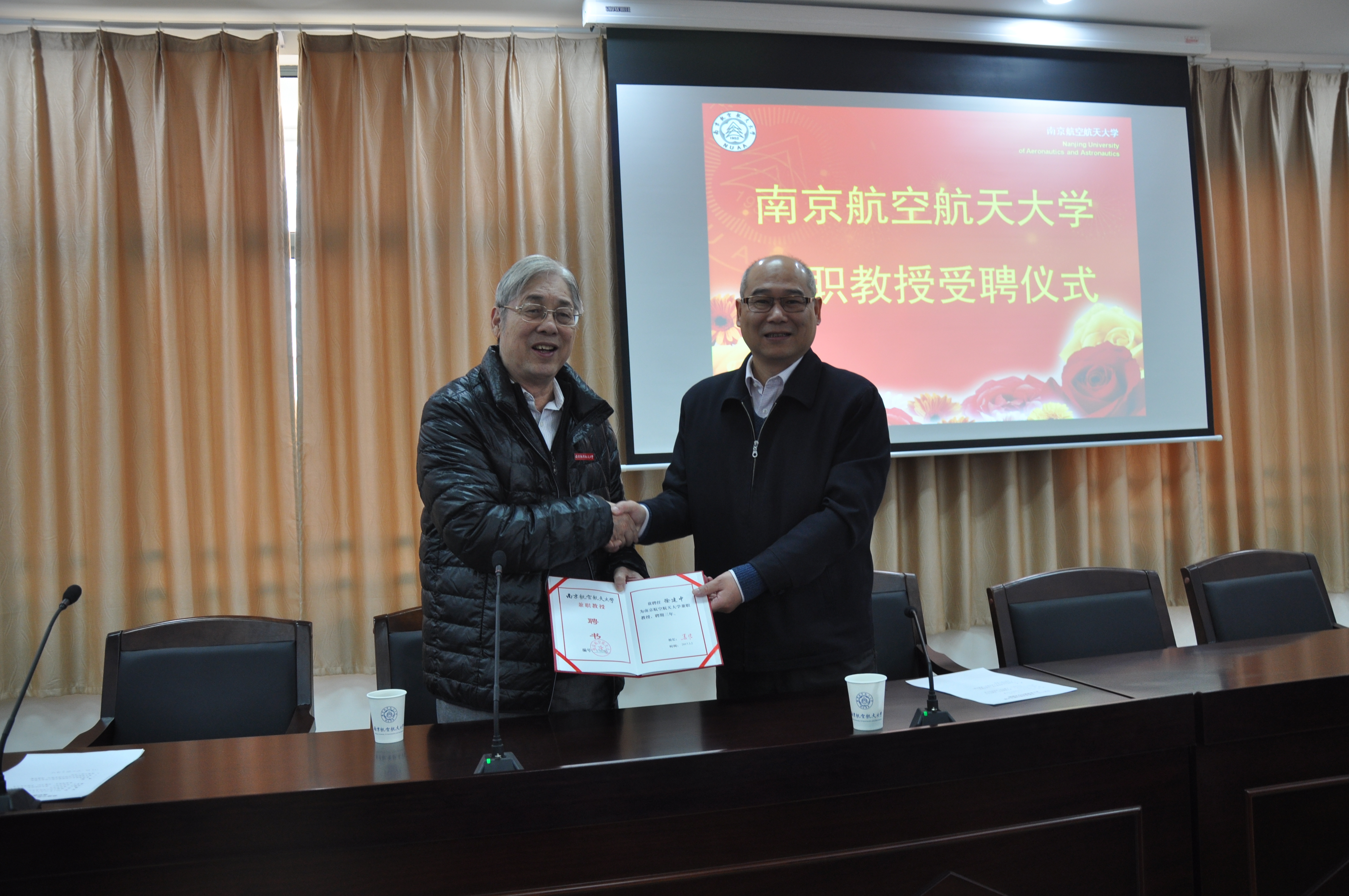 仪式上,黄志球代表学校为徐建中颁发了兼职教授证书并佩戴校徽。刘鑫致辞,对聘请徐建中为我校的兼职教授表示祝贺,并向与会人员宣读了徐建中简历。