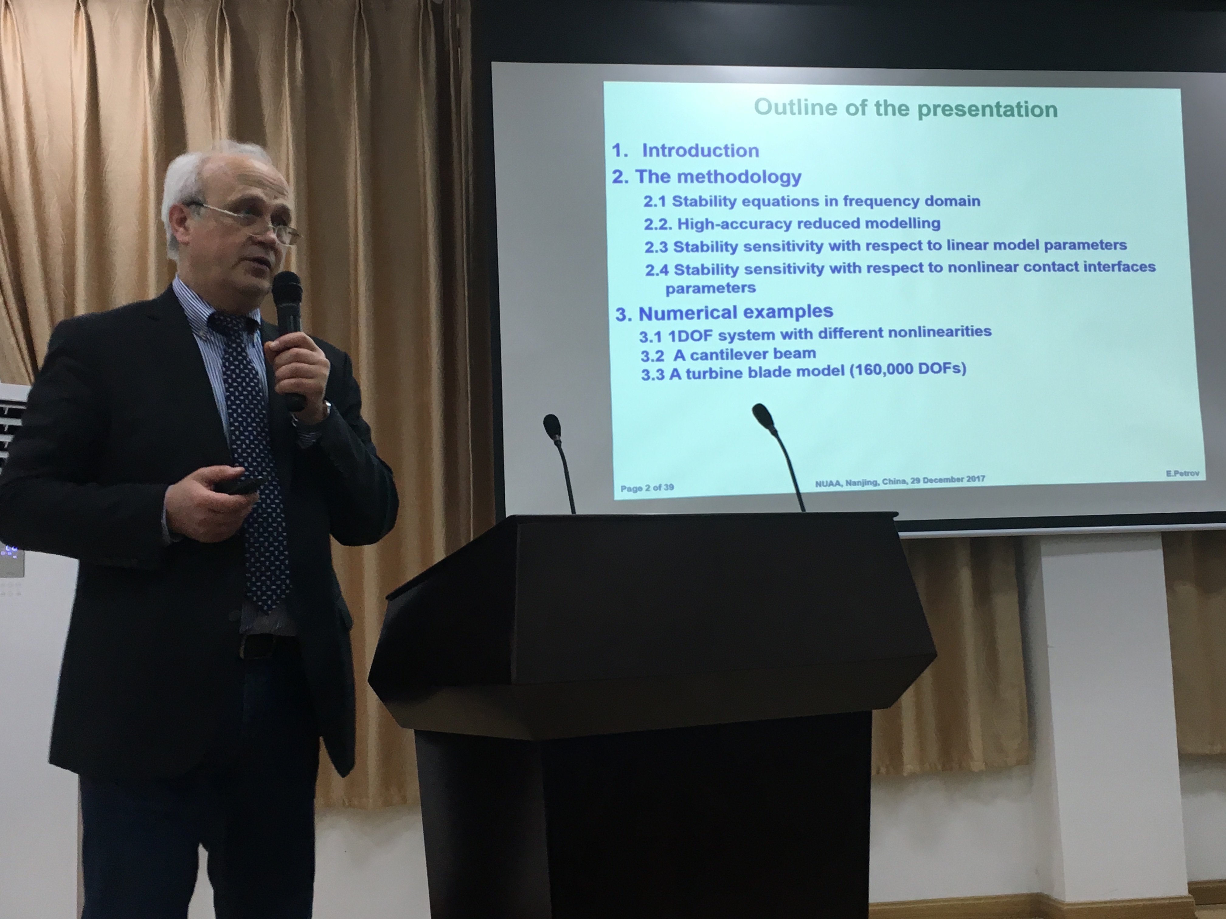 2017年1228日下午,英国苏塞克斯大学E. Petrov教授应我院臧朝平教授邀请,来我院做了题为“用高保真模型分析燃气轮机结构非线性振动的稳定性”的精彩学术报告。报告在我院十号楼六楼报告厅进行,由臧朝平教授主持,我院五十余名教师和博士、硕士研究生共同参加了此次报告。