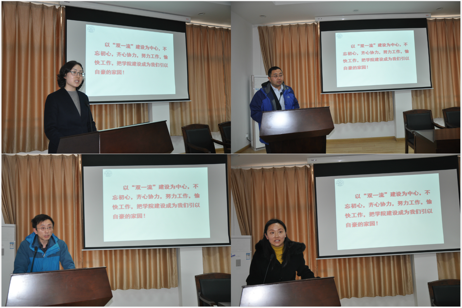 首先,刘鑫介绍大会议程并代表学院党委做学院2017年党建工作总结。她从切实履行党建主体责任、规范基层组织建设及2018年学院党建工作思路等三个方面对过去一年学院党建基础工作进行了成果汇报,并提出新一年的工作构思。然后,崔海涛代表学院做2017年行政工作总结。他从学科与平台建设、师资队伍、人才培养、科学研究、对外合作及其他等五个方面进行了业绩梳理,学院各方面发展势头良好。随着国家对行业建设的大力发展,面对既是机遇也是挑战的大环境,学院发展任重而道远。