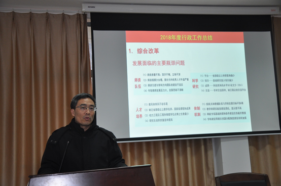 紧接着,崔海涛做学院行政班子工作总结,他从综合改革、学科建设、师资队伍、人才培养、科学研究和平台建设等六个方面,客观阐述了学院在2018年不忘初心,筚路蓝缕地奋斗历程。他表示,学院各项工作取得的成绩,是全院上下共同努力的结果,向各位表示诚挚地感谢。2019年开启了新征程,学院将不忘初心,抢抓机遇,努力拼搏,争创一流,力争实现新跨越。