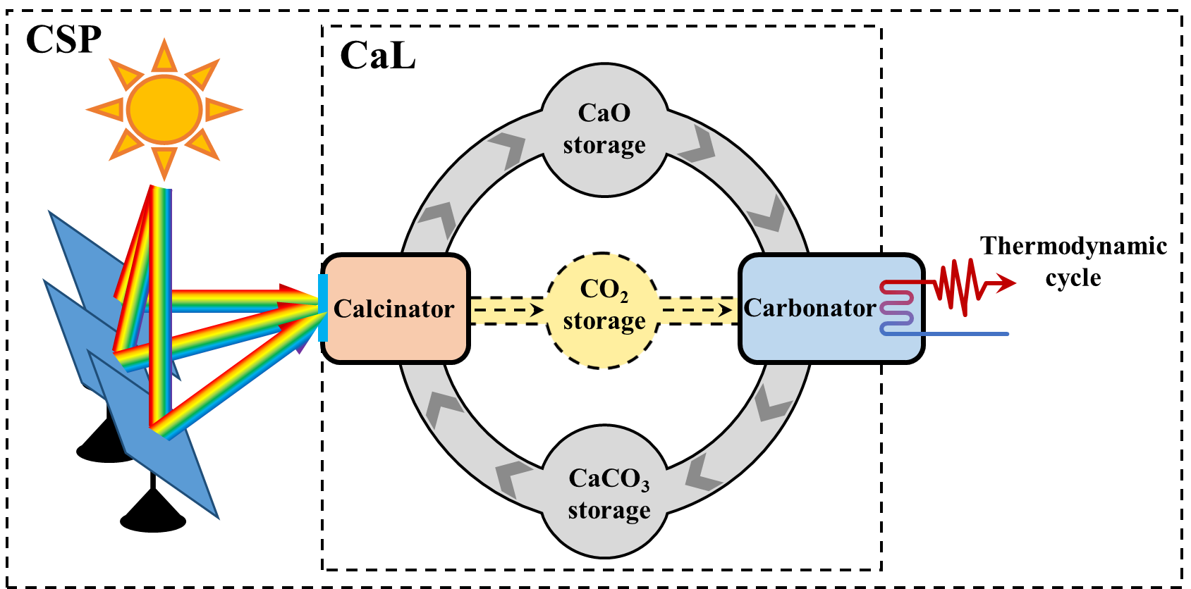 聚光太阳能发电(Concentrated Solar Power, CSP)技术近年来发展十分迅速,这种太阳能利用方式可以克服太阳能固有的间歇性和波动性的特点,通过储热可以实现24小时不间断供电。光热发电技术不断升级换代,对储热系统的要求也越来越高,传统的显热和潜热储热材料已经难以满足第三代CSP系统对高温储热(≥700℃)的需求。基于CaCO3热分解及CaO碳酸化的钙循环(Calcium Looping, CaL)热化学储能系统具有原料来源广、储能密度高、储能时间长、可提高热能品质等诸多优势,是一种十分具有竞争力的高温储热方案。但是目前的太阳能驱动的CaL热化学储热系统无法实现太阳能的直接高效转化与存储,面临着太阳能转化效率和储热效率过低的问题。