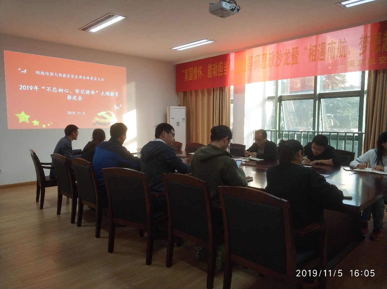 2019年11月5日,tyc7111cc太阳成集团燃烧传热与热能系党支部在10号楼400会议室召开了党员大会暨“不忘初心,牢记使命”主题教育推进会。此次支部会议由颜应文书记主持,支部全体党员同志参加学习。