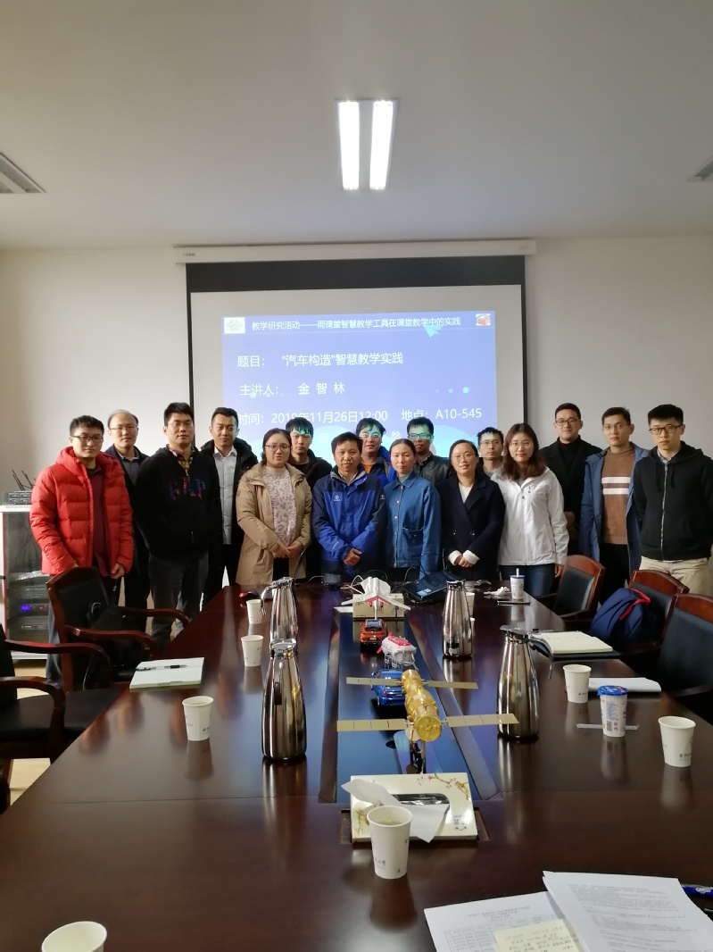首先车辆工程系金智林副教授给老师们做“《汽车构造》智慧教学实践”的分享报告。金老师从为何进行智慧教学出发,到如何进行智慧教学,分享他参与雨课堂的心路历程。他结合自己在清华大学培训班的学习,及自己在《汽车构造》课程的实践,讲解了如使用雨课堂这一智慧教学工具。他从设计课件、开启雨课堂授课、课堂动态把握、随机点名、结束授课/查看课后小结、制做预习课件及作业推送、查看学生预习情况/批改主观题、总结数据分析等方面,着重讲解了如何做好课前、课中、课后准备,如何用这一工具引导学生预习;课堂上如何快捷签到,如何快速检测知识点,如何引导开小差的学生注意力转到课堂中,如何用投稿开启头脑风暴,激发学生思维等;课后作业的布置与提交等。金老师讲得生动,讲解内容丰富,传授干货满满,现场的老师听得专注。