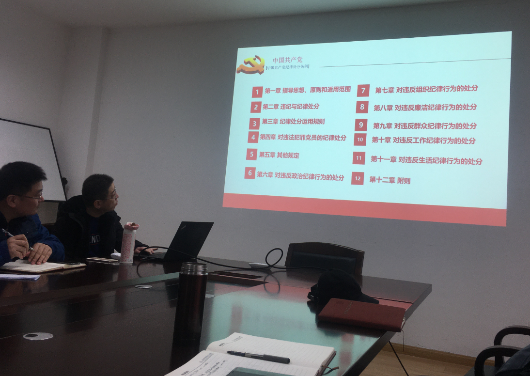 支部纪检委员漆文凯组织全体党员认真学习了《中国共产党纪律处分条例》。《条例》以马克思列宁主义、毛泽东思想、邓小平理论、“三个代表”重要思想、科学发展观、习近平新时代中国特色社会主义思想为指导,依据党章和宪法、法律,结合党的建设与实践,以党内法规的形式明确回答了党的纪委和纪律处分方面等一系列重大问题。同时,也将党的纪律的严肃性,通过将法律机制引入到党的队伍建设中。漆文凯重点强调了作为党员,政治纪律的26条“高压线”碰不得,严禁在重大原则问题上不同党中央保持一致;严禁公开发表反党言论;严禁妄议党中央大政方针、公开丑化党和国家形象、公开诋毁污蔑英雄模范等党的规矩。