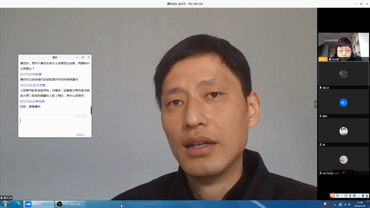 报告中,唐云冰首先从核心部件出发,分析了微型发动机与燃气轮机的结构特点、工艺难点与市场用途。“品质可靠的发动机都是试出来的,离不开先进的试验台”,唐云冰说。随后,他用一系列图片和视频向大家展示了各种先进的试验设备和微型发动机测试平台,演示了真实发动机的试车过程。最后,唐云冰结合自己多年的工作经验向大家介绍了微型航空发动机与燃气轮机的发展趋势,就几点关键技术提出了自己的见解和展望。报告内容精彩纷呈,语言深入浅出,在线旁听的外校非本专业学生也受益匪浅。