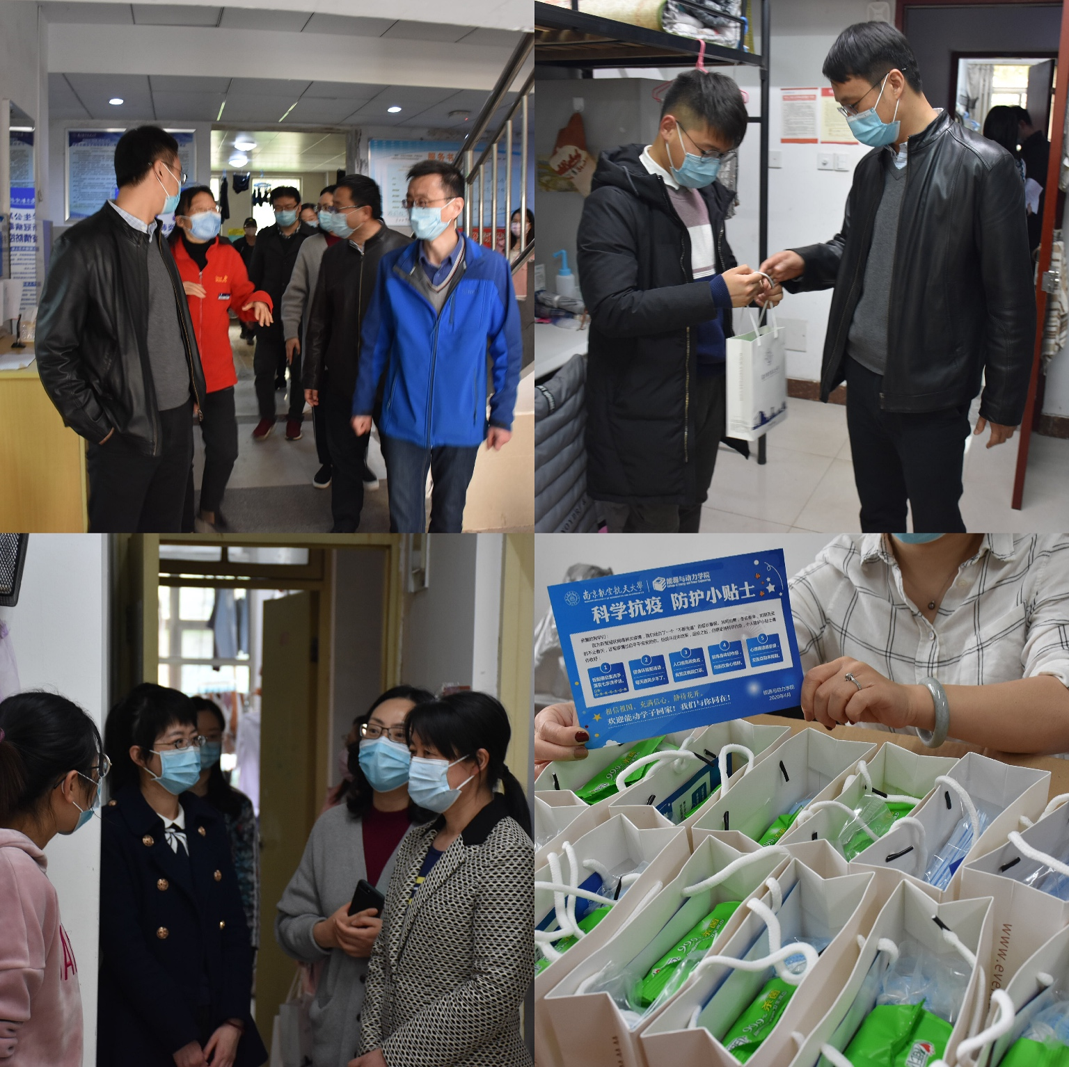 在学生宿舍,学院领导和老师们关切地询问了学生的身体、就业和毕业情况,叮嘱同学们注意身体健康,文明离校、安全离校,并鼓励毕业生在这个特殊的时候奔赴祖国各地建功立业,与祖国和人民共克时艰。同时,一行人为返校毕业生送上了学院精心准备的返校爱心礼包,礼包内装有口罩、卫生湿巾、洗手液等防疫物资,并为同学们贴心地准备了在校期间的防疫小贴士。