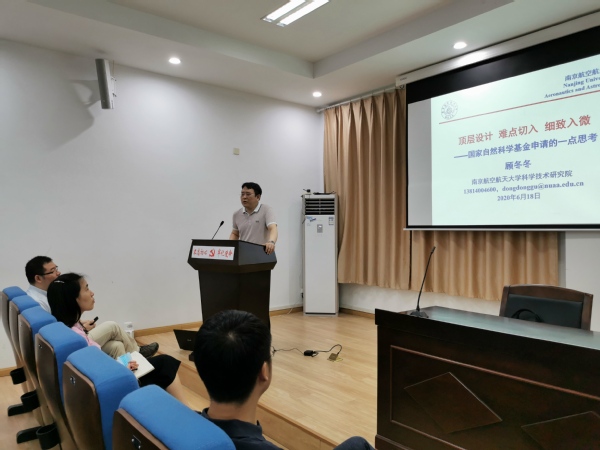 顾冬冬做了题为《顶层设计、难点切入、细致入微—国家自然基金申请的一点思考》的报告,基于学校和学院基金申报的现状,分析了学院近年来基金申报工作的优势和不足。而后,从“选题的背景”、“如何凝练科学问题”、“如何撰写基金申请书”等多个方面和申请人、评审专家、基金委工作人员等多个视角对基金申请书的撰写进行了讲解,并结合个人申报优青的经验,细致介绍了优青申报的要点。
