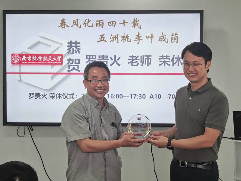 王中叶在致辞中感谢罗贵火老师对学院发展做出的重要贡献,并祝福罗老师的退休生活如意美满。他表示,罗老师从教近40年,身体力行地践行了南航“团结、简朴、唯实、创新”的校风,广大教师要以罗老师为榜样,不忘初心,踏实工作,努力做好教书育人工作,落实立德树人根本任务,希望罗老师在退休后能持续关注学院发展,在学科建设、学术研究、帮助指导青年教师等方面继续发挥余热,为学院的发展继续贡献力量。