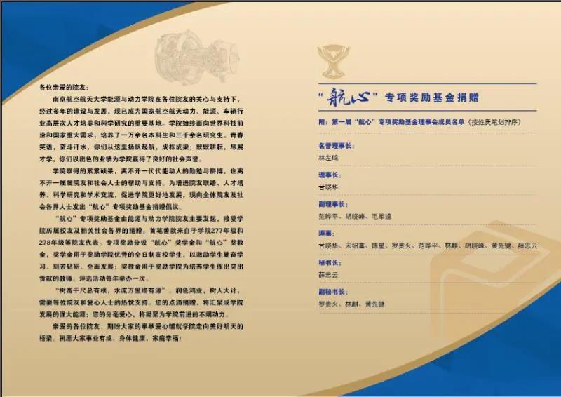 航心”专项奖励基金由tyc7111cc太阳成集团院友主要发起,接受学院历届校友及相关社会各界的捐赠。首笔善款来自于学院277年级和278年级等院友代表。专项奖励分设“航心”奖学金“航心”奖教金,奖学金用于奖励学院优秀的全日制在校学生,以激励学生勤奋学习、刻苦钻研、全面发展;奖教金用于奖励学院为培养学生作出突出贡献的教师。评选活动每年举办一次。