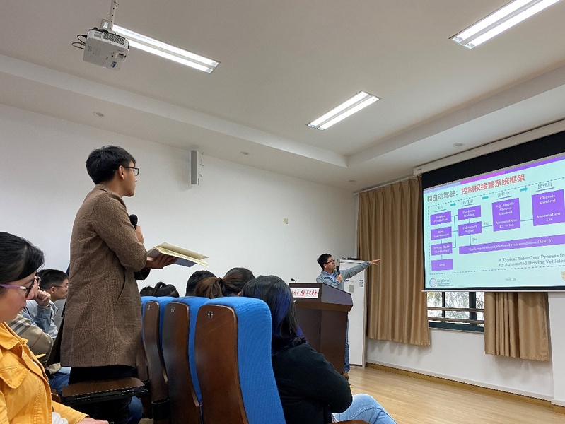 报告后半段,曹东璞为与会师生做了精彩的关于自动驾驶的汇报。曹东璞介绍了国际上自动驾驶领域的几个研究方向,主要包括驾驶员辨识、车辆控制、换道决策技术、风险评估、人机共驾以及云控自动驾驶等,并为与会人员重点介绍了其所在团队目前进行的关于驾驶员特性认知的研究。