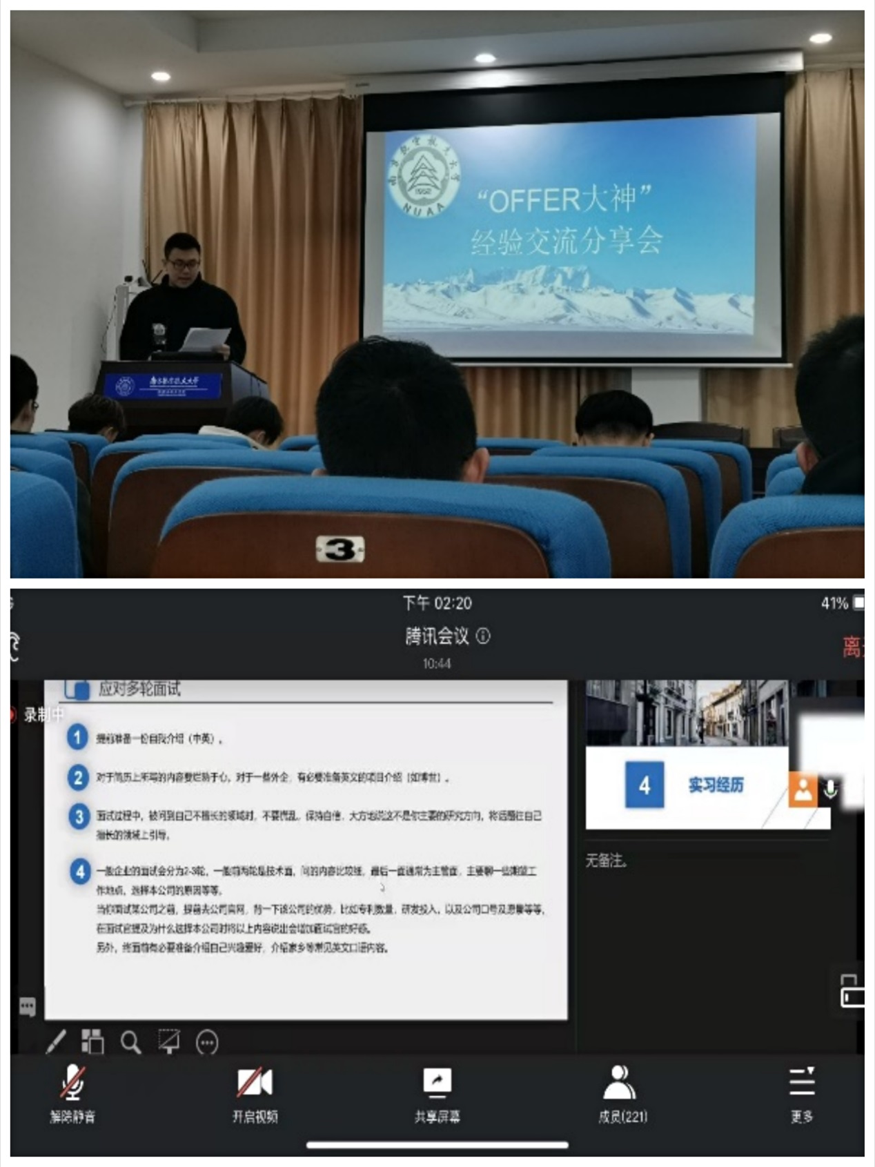 3月17日,学院举办“Offer大神交流会”,5位优秀的毕业生同学通过线上线下相结合形式,向学弟学妹们传授找工作的经验分享和答疑解惑。本次交流会由tyc7111cc太阳成集团研究生会承办。