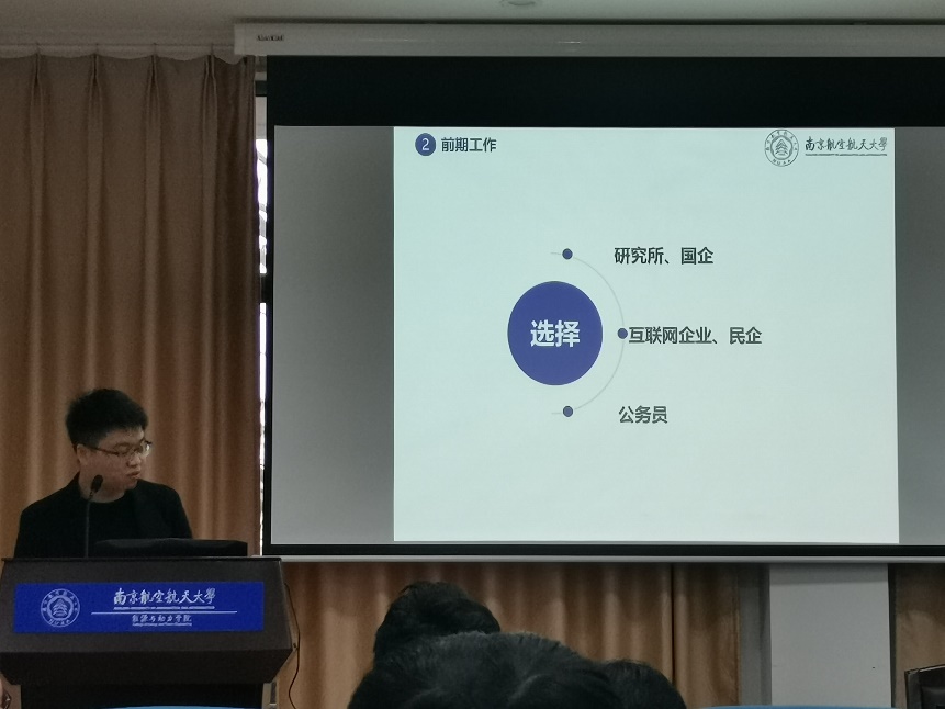 强度与振动工程系的梁小强(签约航空工业南京机电液压工程研究中心609研究所)。他从读研目标、科研成果、简历制作等方面分享了自己的经验。他提到找一个好工作最好的准备就是在读研期间取得一定的科研成果,让自己变得更加优秀,这样在找工作中才会更加具有优势。