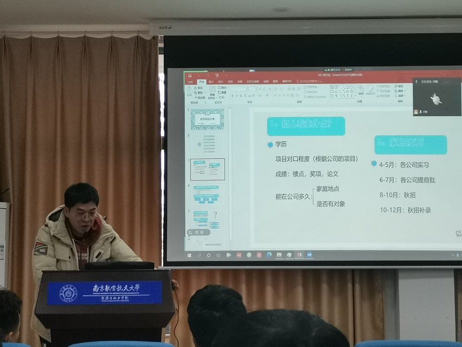 来自车辆工程系的李静轩(签约华为智能汽车解决方案BU)从招聘信息收集、简历制作、面试经验、实习经历和企业推荐等五个方面进行介绍。最后重点介绍了自己所推荐的企业,并且强调了如何在为招聘的笔试做准备。