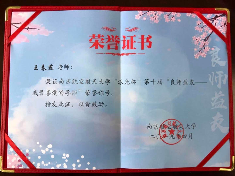 多年来,王春燕教授始终将教导学生的责任装在心里、扛在肩头,带领南航学生取得一份又一份傲人的成绩,她本人也得到了学生的一致好评,2019年获太阳成tyc7111cc“派光杯”第十届“良师益友——我最喜爱的导师”荣誉称号,2021年获校“五四”评优“优秀团学导师”荣誉称号。