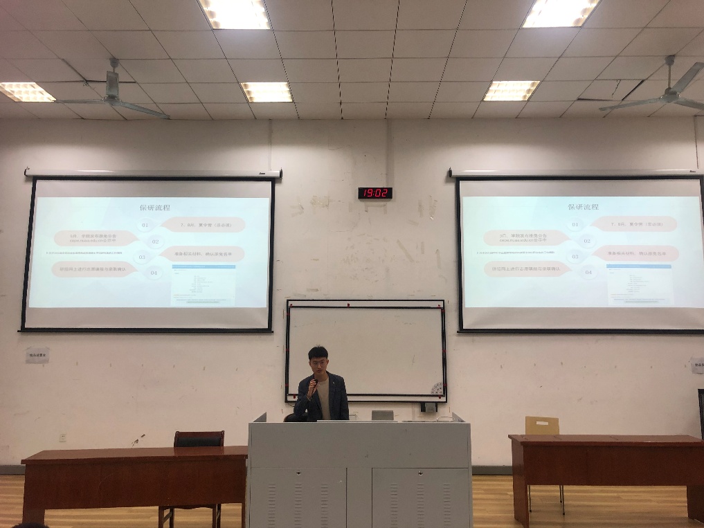 首先,由保研至南航本校的滕家柱同学分享了自己的保研经历,详细地介绍了学校的保研流程和相关材料的准备。他建议同学们加强专业课学习,为后期的保研面试、考研复试打好基础,鼓励大家积极提高科技创新能力。