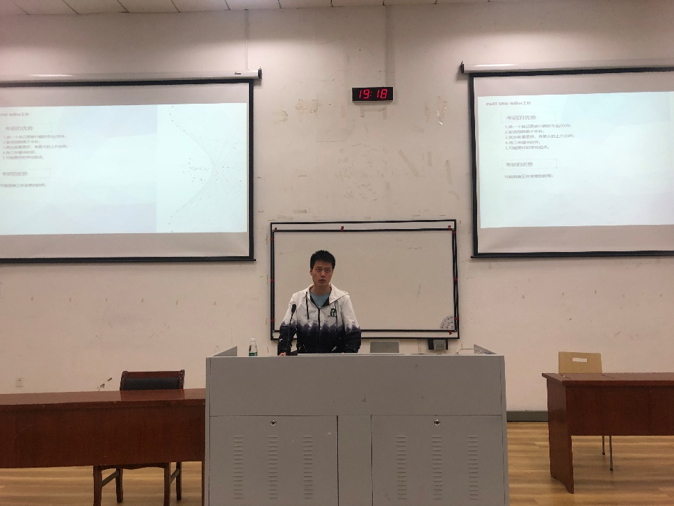 考研至本校的陈聪同学分享了考研的心路历程,他向同学们推荐了参考资料并交流了自己的学习经验,提醒同学们要以乐观向上的心态、全力以赴的态度积极迎考。