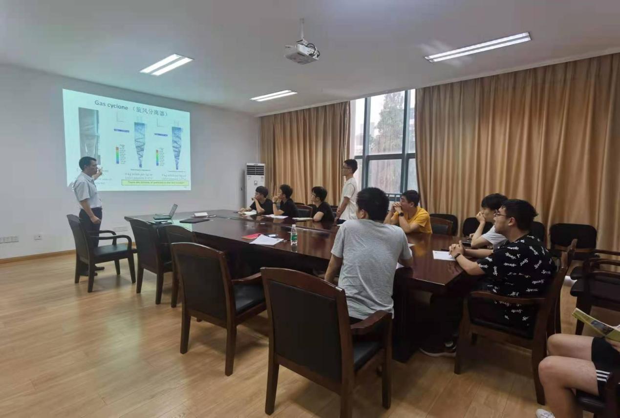 交流环节,褚开维教授热心解答师生困惑,和与会师生深入探讨了计算流体动力学和离散单元法(CFD-DEM)数值模拟平台研究颗粒-流体多相流系统的内在运行机理,分享了粗粒化(coarse-grained/CG)CFD-DEM方法以及在固体发动机的初步应用。