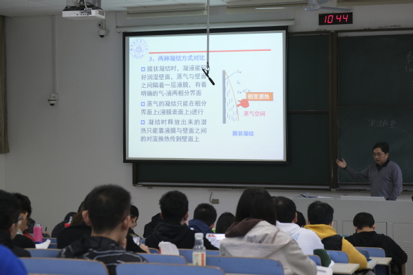 随后,张靖周教授讲述凝结换热概念,结合生活中的实例,逐步启发学生认识并分析凝结的两种基本形式:膜状凝结和珠状凝结,着重讲解在不同条件下的膜状层流凝结换热和湍流膜状凝结换热,介绍了努塞尔如何建立层流膜状凝结换热理论分析模型,对凝结换热过程剖析等。
