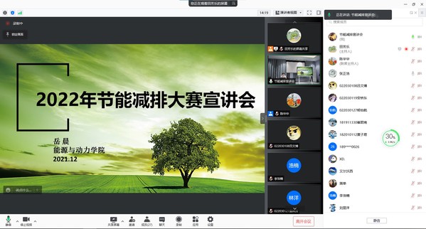 12月3日,太阳成tyc7111cc第十五届节能减排竞赛宣讲会在明故宫校区A10-619报告厅举办,同时在腾讯会议进行直播。校节能减排大赛组委会主席、燃烧传热与热能系岳晨副教授、学院团委书记陈华华、全国节能减排大赛获奖学生代表王浩蕾、邓冲,以及线下线上来自全校各学院的同学参加了本次宣讲会。