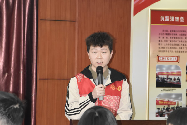 社区党委书记梁晔介绍了“幸福蓝旗”党建项目品牌,讲述了与南航志愿者的合作渊源。学院学生志愿者代表、“夕阳如画,定格幸福”实践团队长李少阳深情回顾了近两年学院在蓝旗社区开展的“夕阳如画,定格幸福”金婚纪念、“蓝精灵少儿驿站——梦想雏鹰”、航空航天科普讲座、日常入户宣传等各类志愿活动,并就参与志愿服务以来的收获和成长谈了认识和思考。