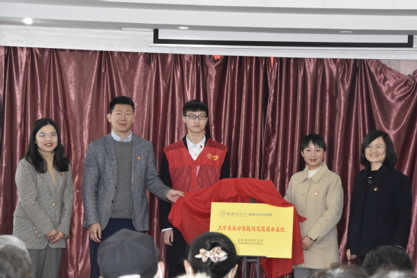 刘向雷、王倩、梁晔、陈华华和学生志愿者代表共同为大学生社会实践与志愿服务基地揭牌。