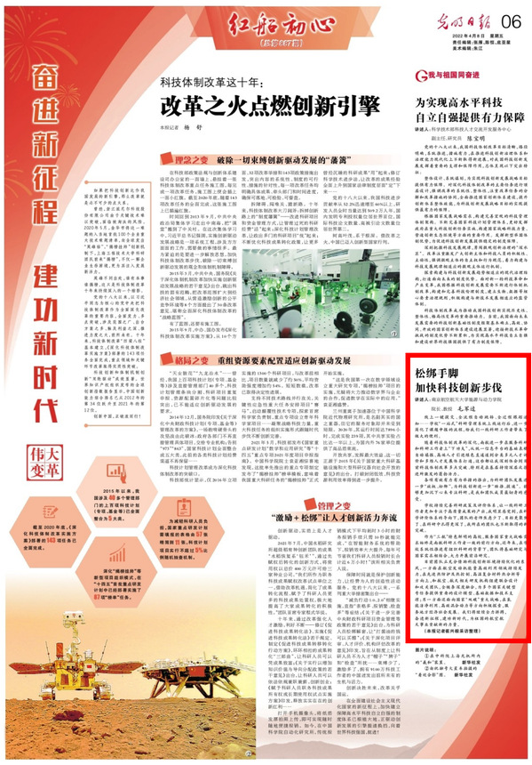 编者按:4月8日,《光明日报》“红船初心”专刊推出“科技体制改革这十年”专版报道,其中在子栏目“我与祖国同奋进”中专访我院毛军逵教授,并发表文章《松绑手脚,加快科技创新步伐》,毛军逵指出科技创新环境的持续优化为学校、学院科研团队释放活力,更高效助推科技进步。现刊载全文如下: