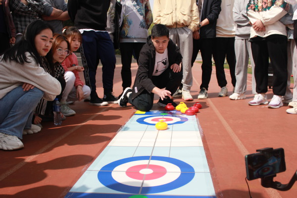 旱地冰壶中,选手们在冰面壁纸上进行微型冰壶比赛,最后一壶投完后,大本营内距中心近的壶的一方获胜。参赛同学大力出奇迹,一记冰壶绝杀,将场上冰壶都击出场外,引来阵阵喝彩。