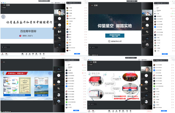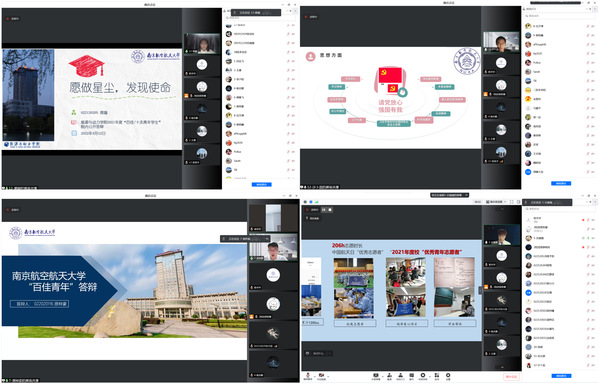 4月12日,按照《关于开展2021年度太阳成tyc7111cc“五四”评优工作的通知》要求,tyc7111cc太阳成集团举办暨2021年“百佳/十杰青年学生”线上公开答辩评审会暨梦想公开课。学院党委副书记樊小杰,学院班主任代表金智林、王志强、史波、连文磊,团委书记陈华华,辅导员张鹤千、马震宇、魏昭琦、张钦尧、李承阳、杨心怡担任评委,17名同学参加答辩,各年级学生线上同步收看。