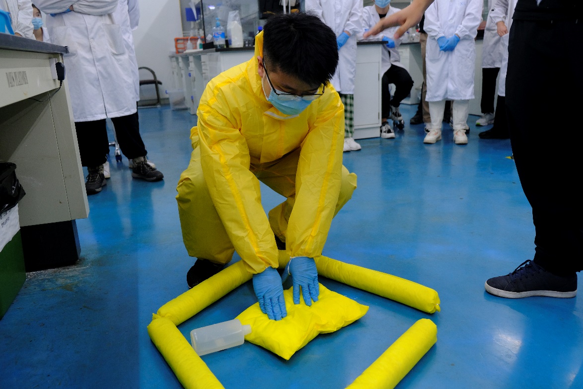 本次活动共设置两个危化品事故场景,第一个事故场景模拟了“实验室内打碎500ml硫酸泄漏”事故,并顺利完成现场人员有序撤离、消除危险源、事故调查与评估等规范化应急处置流程,演练过程中穿插讲解MSDS查阅、应急喷淋装置使用等注意事项。