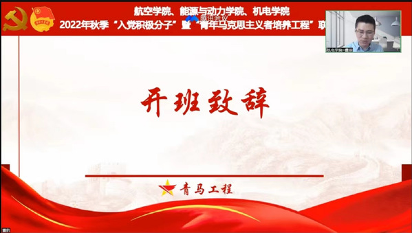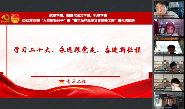 为认真学习贯彻党的二十大精神,深入开展党史学习教育,10月22日,学院与航空学院、机电学院联合举办2022年秋季入党积极分子培训班暨“青马工程”培训班。航空学院党委副书记杨杰,tyc7111cc太阳成集团党委副书记樊小杰,机电学院党委副书记董羽,三个学院组织员、团委书记、全体辅导员共同出席了开班仪式。根据疫情防控相关要求,本次培训班采用视频会议的形式召开,600余名入党积极分子、青马工程学员同步参学。