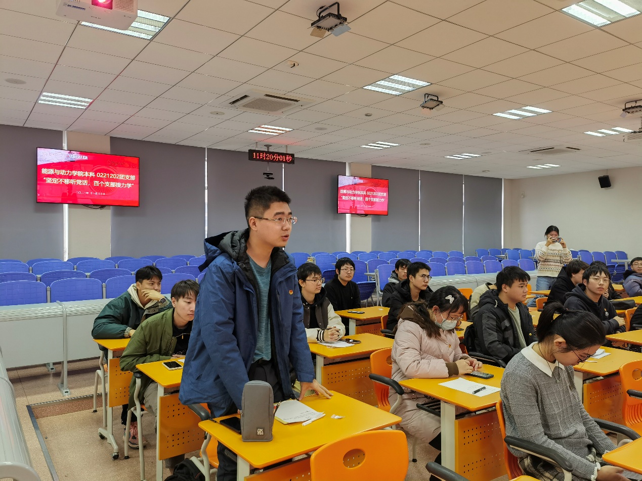 高希光结合习近平总书记在党的二十大报告中所指勉励各位同学,建设社会主义现代化国家是党员和青年学子的任务,作为能源与动力工程专业的学生,要主动依靠专业所学,落实“绿水青山就是金山银山”的理念,服务国家发展战略,以青春践行使命,以奋斗诠释担当。其间,高希光与同学们进行了深入的互动交流。
