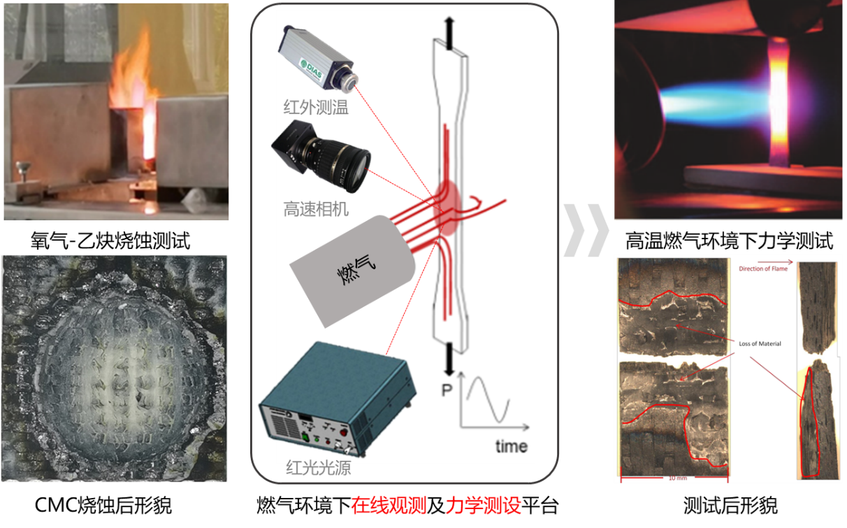 开展CMC服役环境力学测试关键技术攻关,包括高温水氧环境以及高温燃气环境下力学测试技术研究。建立材料级服役环境模拟平台、材料组分性能表征平台、零部件级服役模拟平台、理化性能测试平台、物质结构分析平台和服役环境下结构响应与材料性能演化仿真模拟系统六大平台设备体系。