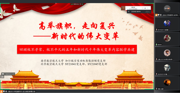 3月10日知行航空发动机智能控制团队与北京航空航天大学能动学院SY21041党支部、SY21045党支部联合开展“高举旗帜,走向复兴——新时代的伟大变革”联学共建。北航能源与动力工程学院辅导员赵玉禄主持活动,我院团委书记、研究生辅导员陈华华参加活动。
