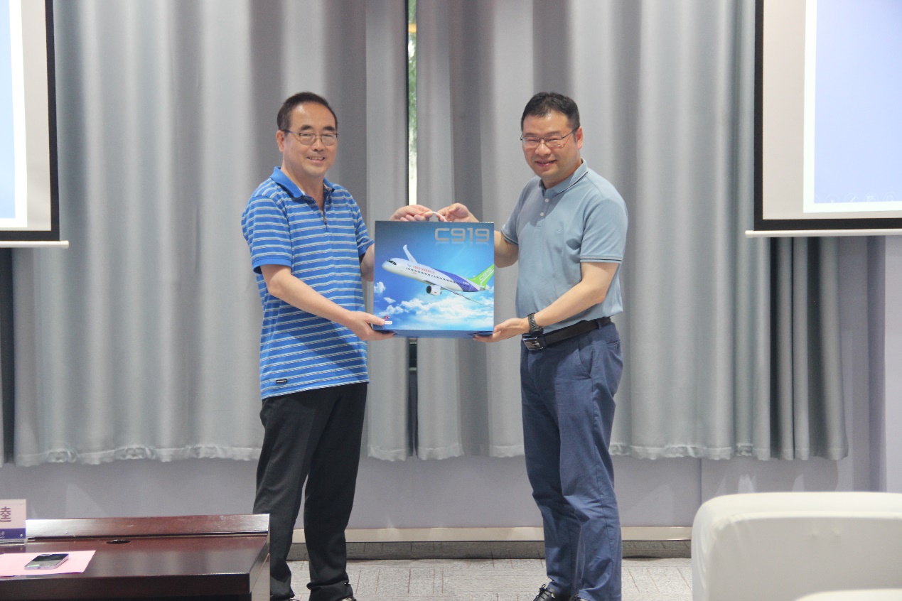讲座后,赵旭东院士接受毛军逵赠送C919飞机模型,并与宣益民院士合影留念。