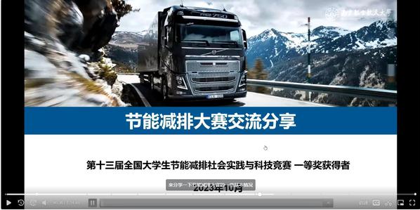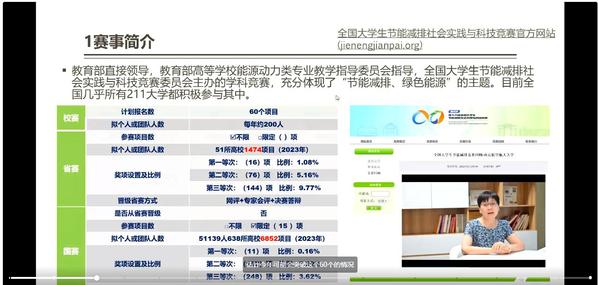 第十三届全国节能减排大赛一等奖团队队长、博士生周小川通过视频方式从如何选题、赛前准备、队伍组建等方面分享竞赛经历,引导同学们从往届特等奖作品中寻找创新思路,并让同学们意识到团队合作的重要性。
