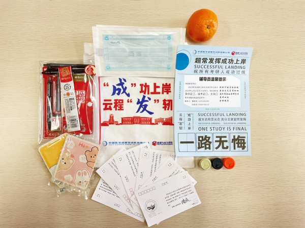 礼包以 “成功上岸,云程发轫”为主题,内含文具包、口罩、暖身贴、橙子、咖啡胶囊、温馨提示卡等物品,分别寓意着“金榜题名”、“温暖守护”、“‘橙’功上岸”、“幸运降临”。礼包内还放置了领导班子成员、老师们亲笔签署的祝福明信片,满满的深情与期望,成为能动考研学子们最珍贵的精神力量。老师们叮嘱大家在考研复习的关键阶段要坚定信心,劳逸结合,保持稳定积极的心态。同学们纷纷表示一定会全力以赴,给自己交上一份满意的答卷,不辜负学院和老师们的殷切期待。