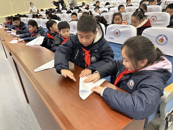 趣味折纸活动环节。志愿者代表从折纸的历史与折纸在航空、航天工程应用两个方面进行介绍,展示了折纸艺术的魅力,引得小学生们阵阵惊叹。活动的最后,志愿者代表通过讲解与演示结合的方式,指导小学生折叠歼-20纸飞机模型,寓教于乐,让他们在实践中收获成长。