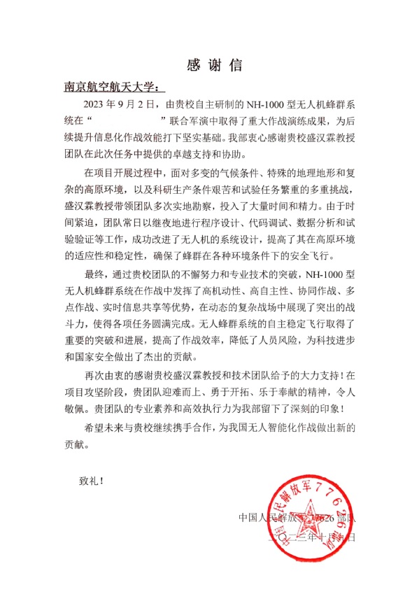 9月2日,学院盛汉霖教授收到了来自中国人民解放军77626部队发来的感谢信,对方感谢盛汉霖教授及团队自主研制的NH-1000型无人机蜂群系统在某联合军演中取得了重大作战演练成果,各项任务圆满完成,为科技进步和国家安全做出了杰出的贡献!