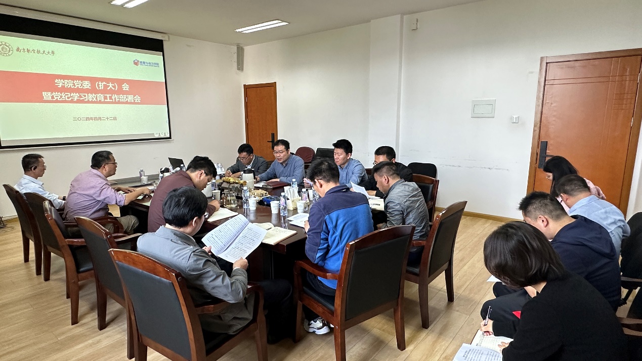 为扎实开展党纪学习教育,落实学校党委工作要求,4月22日,学院召开党委(扩大)会暨党纪学习教育工作部署会,学院党委委员、领导班子成员和全体教工党支部书记参会。会议由学院院长毛军逵主持。