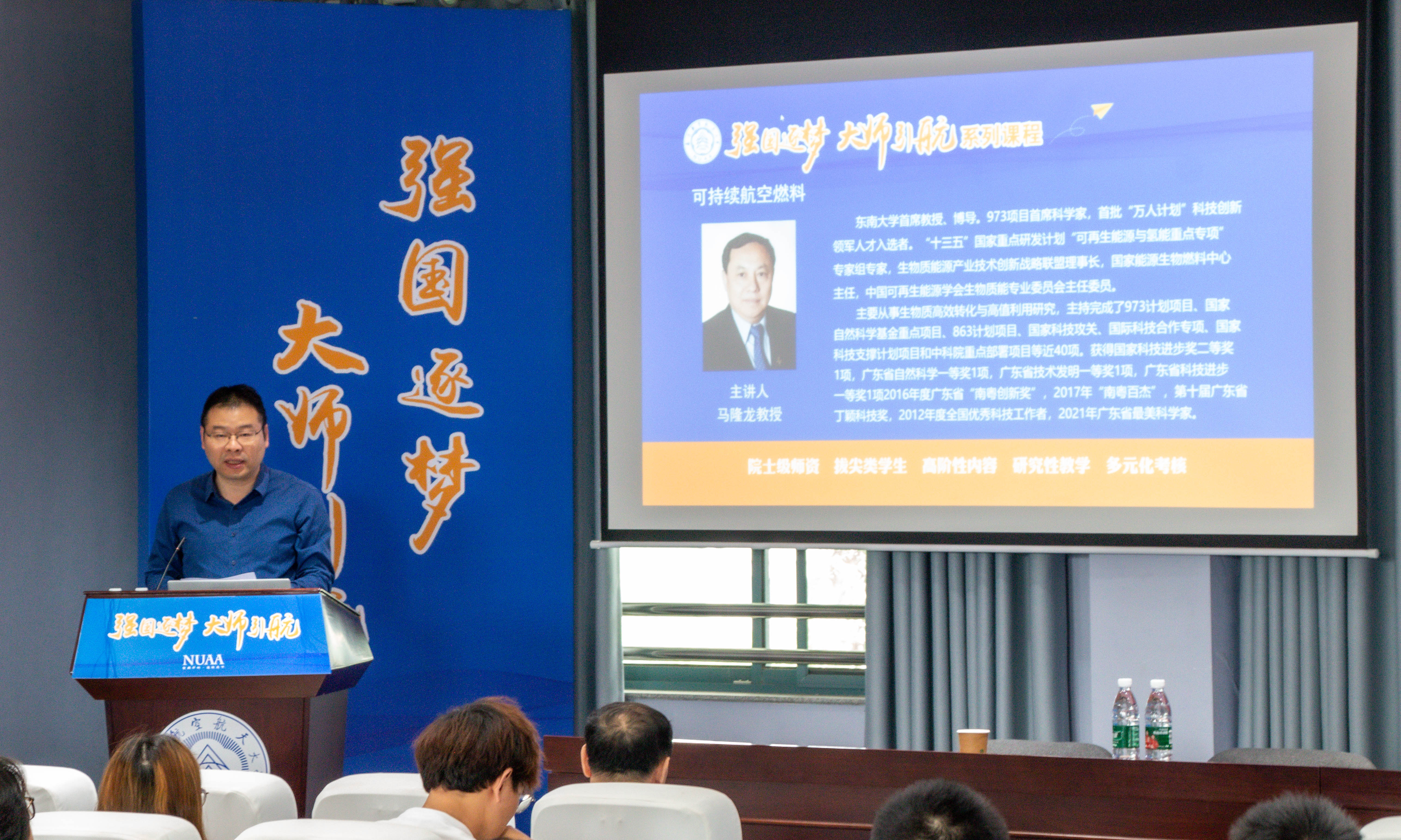 6月1日,“强国逐梦,大师引航” 系列课程之《先进能源前沿》大师课第四讲如约开讲。可持续清洁能源,是国家构建现代能源体系、实现“碳达峰 碳中和”战略目标的重要技术保障,也是低碳航空动力和绿色能源航空器技术发展的关键技术支撑。本次课程,宣益民院士为同学们邀请到东南大学马隆龙教授讲授 “可持续航空燃料”。课程由学院院长毛军逵教授现场主持。