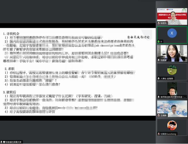 在自由交流与讨论环节,双方围绕求职、就职等议题展开了深入的探讨。针对大家的问题和困惑,赵海燕结合南航的人事政策和高层次人才支持计划,给予了详细、耐心的解答并提供宝贵的建议和指导,为参会的青年才俊提供了详细的求职指导和职业发展规划。她表示,南航将竭诚为青年人才提供良好的发展环境和政策支持,助力他们在学术和职业生涯中取得更大的成就。