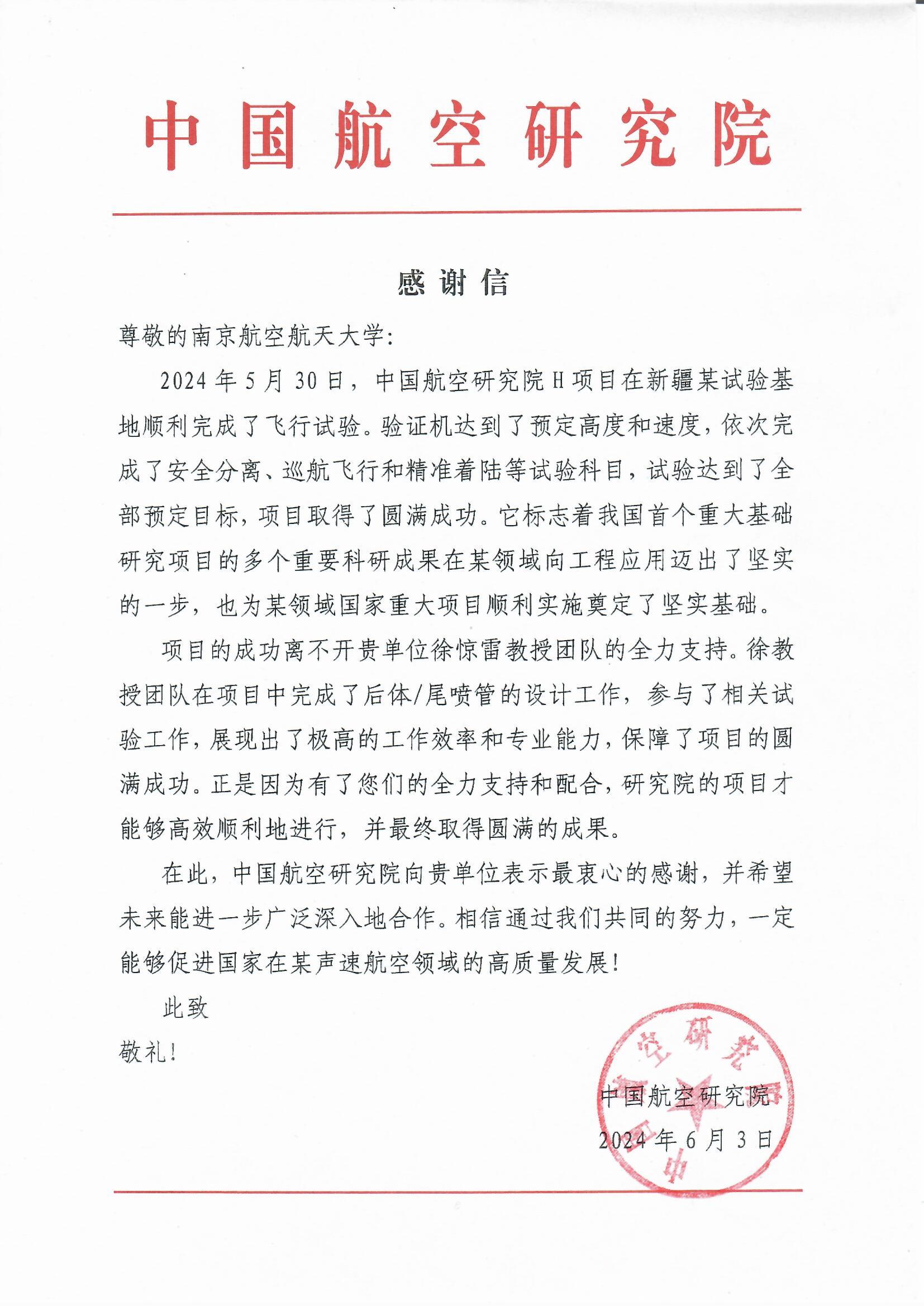 学院徐惊雷教授收到来自中国航空研究院的感谢信,对方感谢徐惊雷教授团队在项目中完成了后体/尾喷管的设计工作,参与了相关试验工作,展现出了极高的工作效率和专业能力,保障了项目的圆满成功。