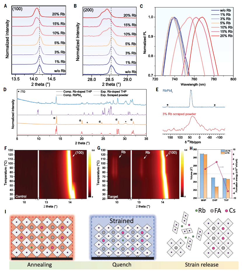 在原位X射线、固态核磁表征和理论计算的支持下,研究揭示了薄膜应变在促进Rb+稳定进入钙钛矿晶格A位的决定性作用。该项研究工作首次实验证明尺寸小于容忍因子下限的阳离子亦可通过应变调控方式稳定嵌入钙钛矿晶格,刷新了对钙钛矿材料掺杂准则的理解。该发现为钙钛矿薄膜组分工程提供了全新视角,并为后续构建高性能、长寿命的光伏器件提供了理论基础与技术支撑,具有深远的科学意义与工程价值。