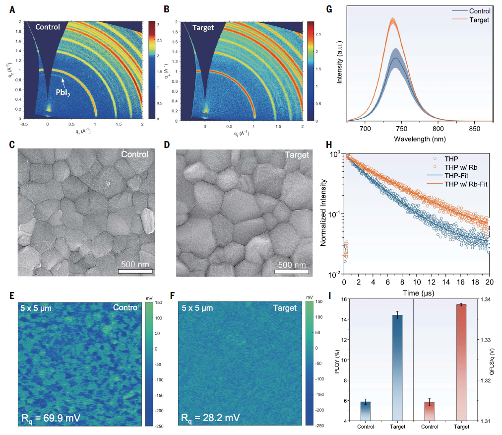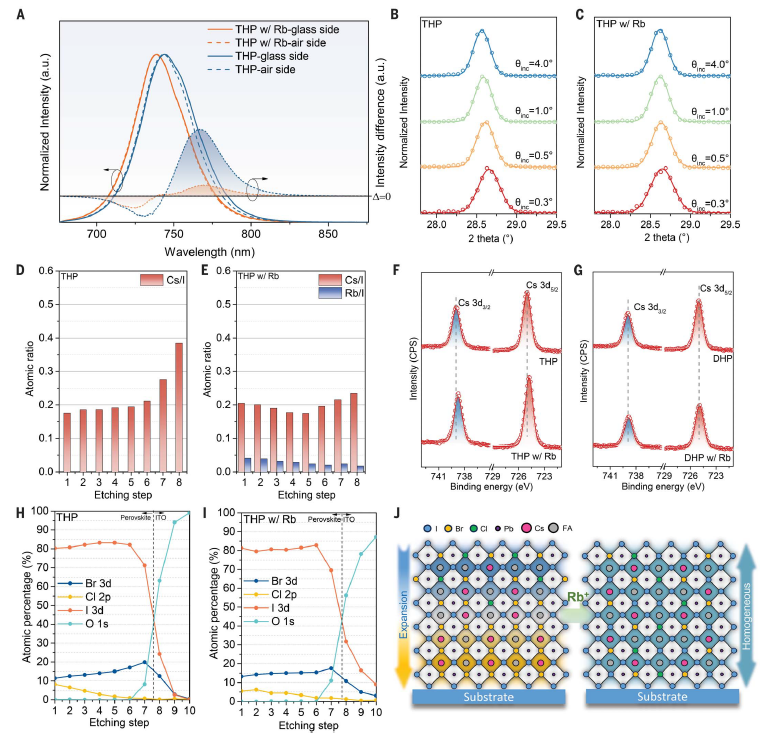 多尺度材料表征,阐明了Rb+掺杂在改善钙钛矿薄膜面内以及面外方向上组分均匀性中的核心作用。进一步通过荧光量子产率测试,观察到Rb+掺杂大幅增强了宽带隙钙钛矿的准费米能级分裂,揭示了器件开路电压的提升机理。