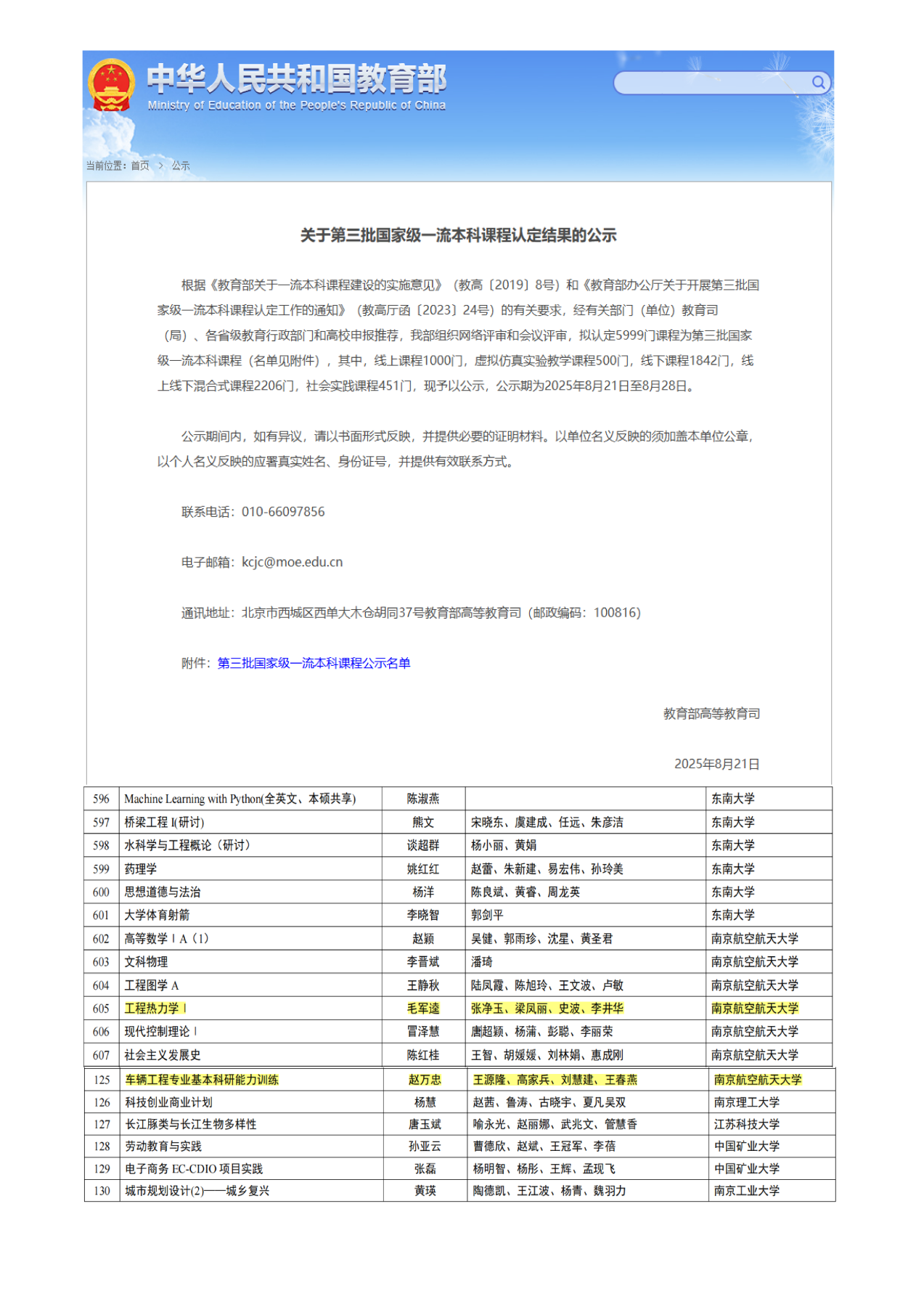 8月21日,教育部高等教育司发布了《关于第三批国家级一流本科课程认定结果的公示》,其中我院毛军逵教授负责的《工程热力学Ⅰ》获评线上线下混合式一流课程;赵万忠教授负责的《车辆工程专业基本科研能力训练》获评社会实践一流课程。