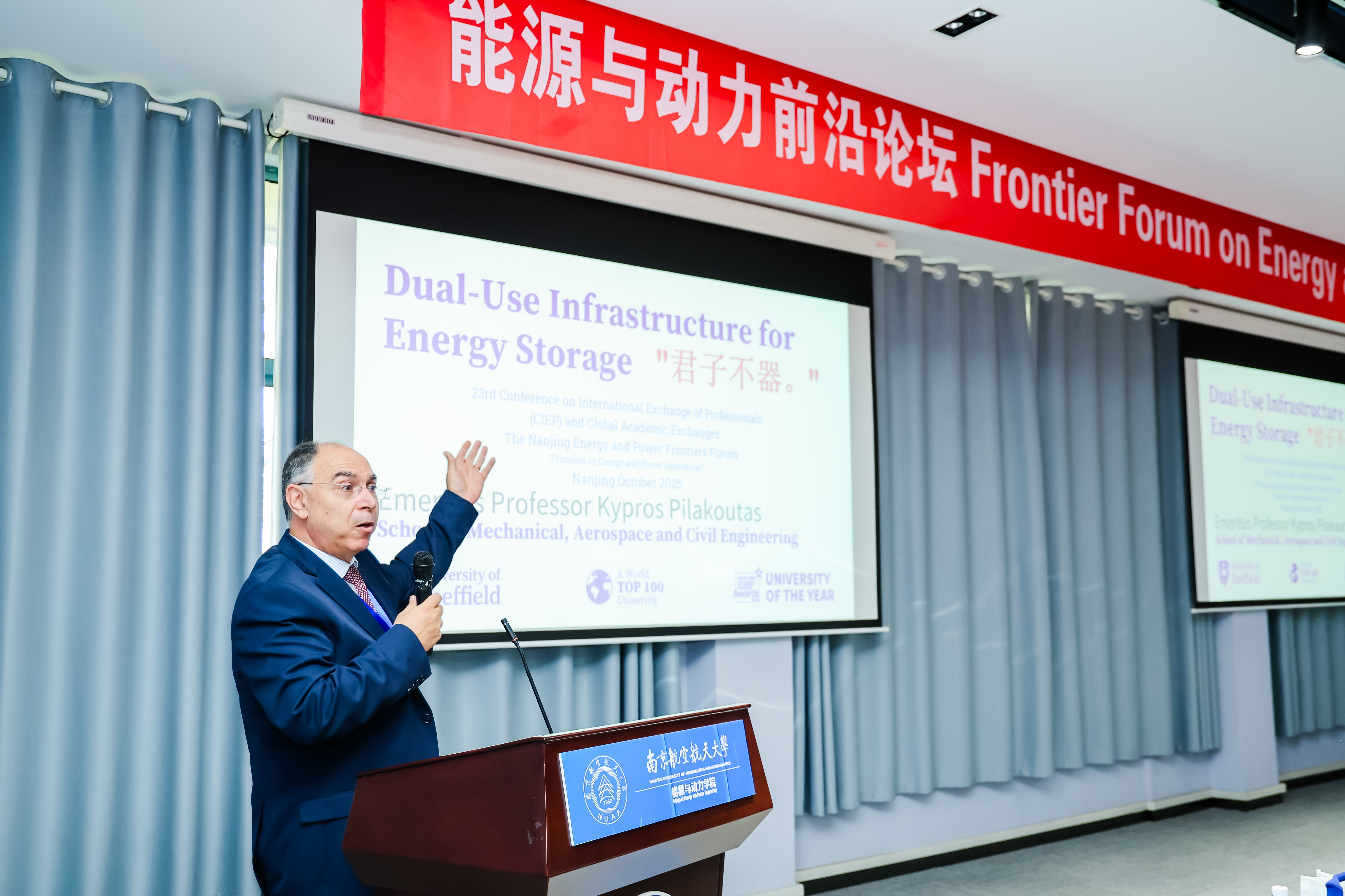 Kypros Pilakoutas 教授(英国皇家工程院研究主席)作了题为《Dual-Use Infrastructure for Energy Storage》的报告,探讨了能源存储基础设施的双重应用前景。