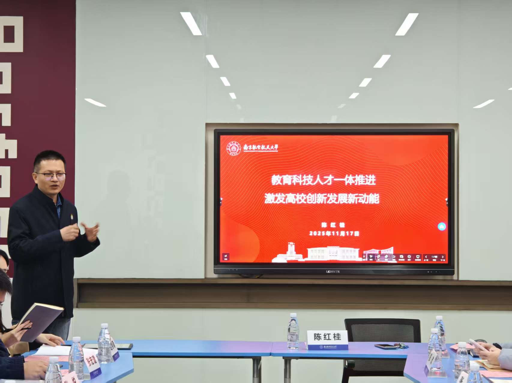 会议特邀马克思主义学院副院长陈红桂作题为《教育科技人才一体推进,激发创新发展新动能》的专题辅导。陈红桂围绕党的二十届四中全会关于教育、科技、人才一体化推进的战略部署,系统阐释了三者协同发展的时代背景、内在逻辑与实践路径。他结合国内外科技竞争态势与南航实际,建议将拔尖创新人才培养工作主动融入国家战略,强化科教融合、产教协同,不断激发创新发展内生动力。